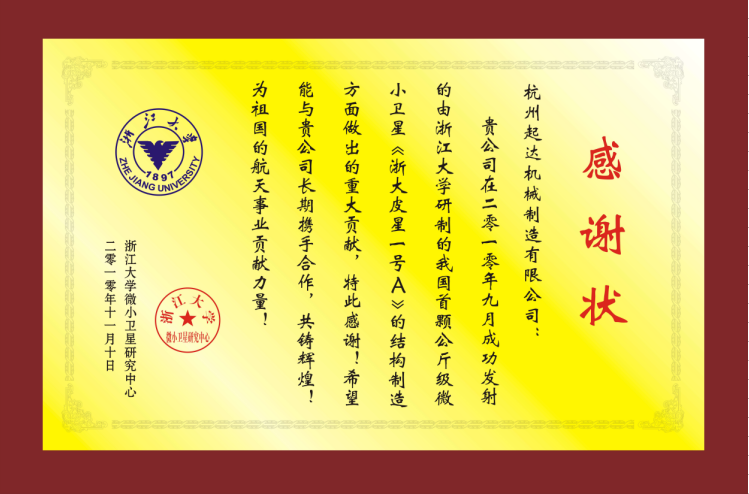 浙江大學微小衛星中心為我公司頒發 “皮星一號” 感謝狀