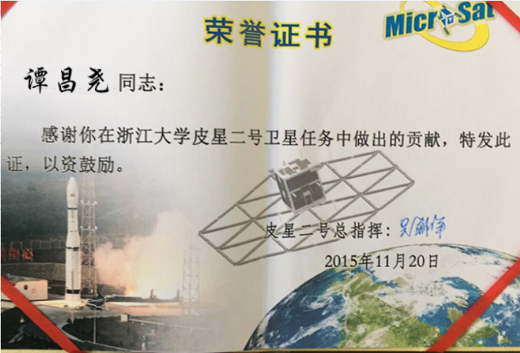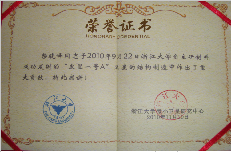浙江大學微小衛星中心為我柴總頒發 “皮星一號” 榮譽證書