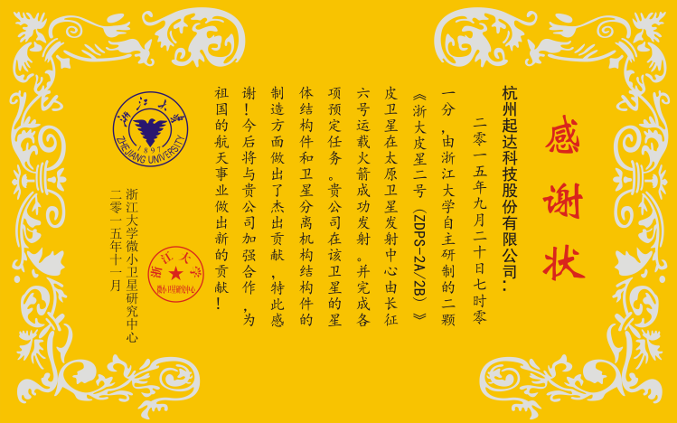 浙江大學微小衛星中心為我公司頒發 “皮星二號” 感謝狀